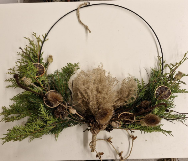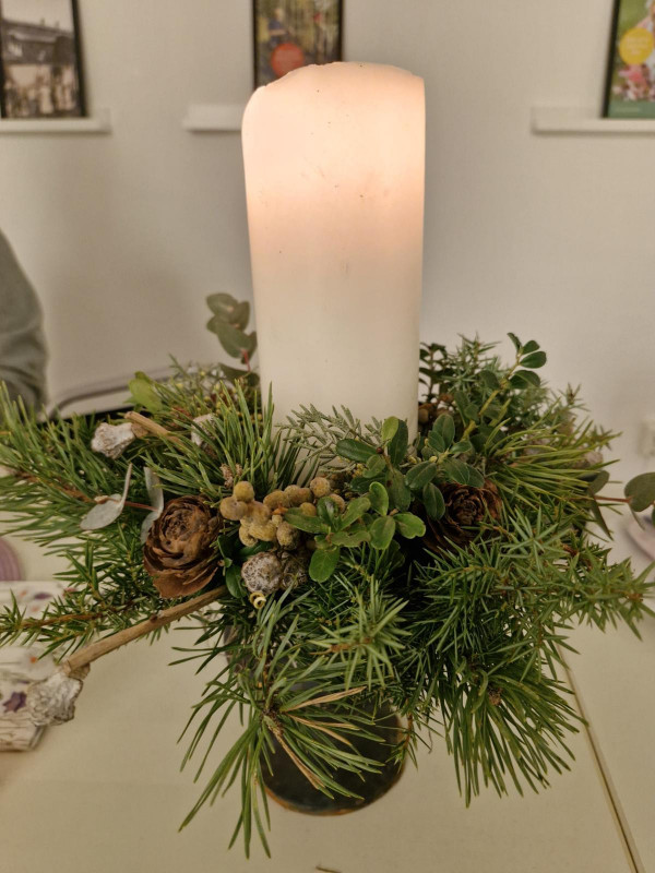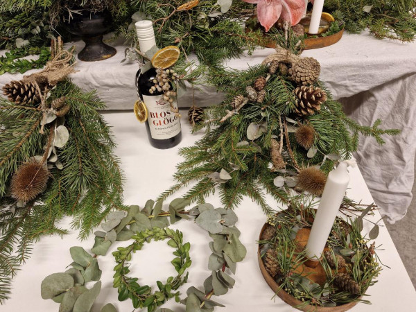 Vi var 8 damer som träffades i vuxenskolans lokal för att bli inspirerade av Anna Jigeryd Franssons vackra höstdekorationer och kransar som hon gjort av vad som finns i naturen. Grunden var halmkransar som sedan täcktes med granris eller mossa, grenar från lärk och mycket annat. Man kan också göra en ring av najtråd eller köpa färdiga ringar i stål och dekorera med slingrande växter. Hon hade även gjort krukor som man istället för oasis lägger en klump med lera i botten och sedan sätter fast kvistar i av diverse slag. Det finns mycket man kan hämta i naturen eller trädgården och använda.
